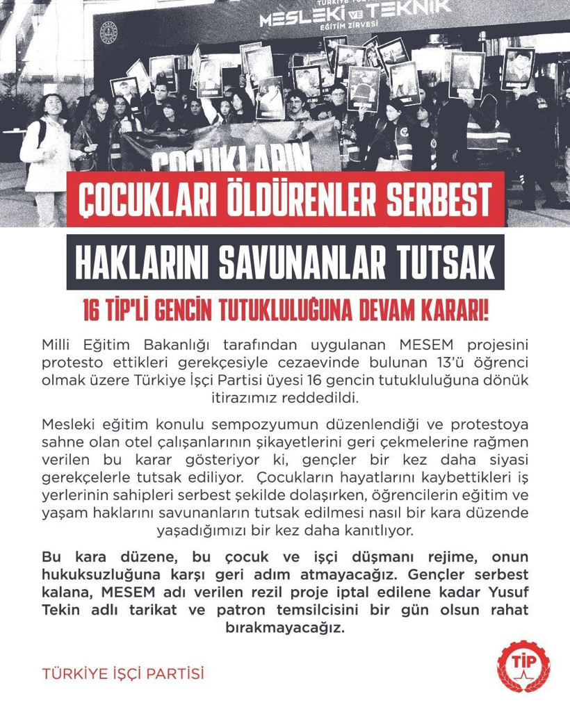 MESEM kapsamında çalıştığı işlerde hayatını kaybeden öğrenciler için eylem yapan16 TİP’li gencin tutukluluğuna devam kararı verildi.