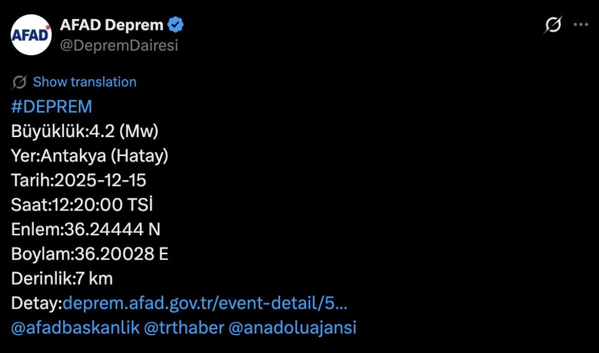 Merkez üssü Antakya olan 4.2 büyüklüğünde bir deprem meydana geldi.