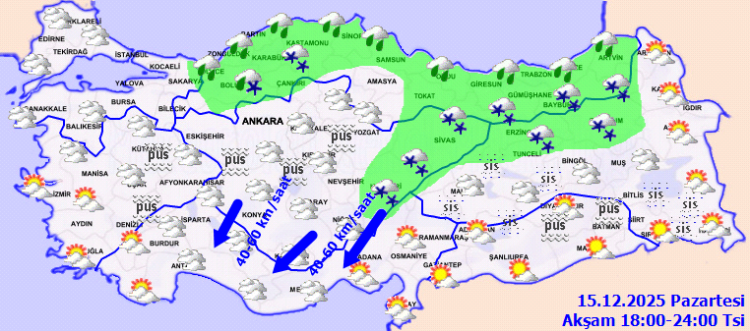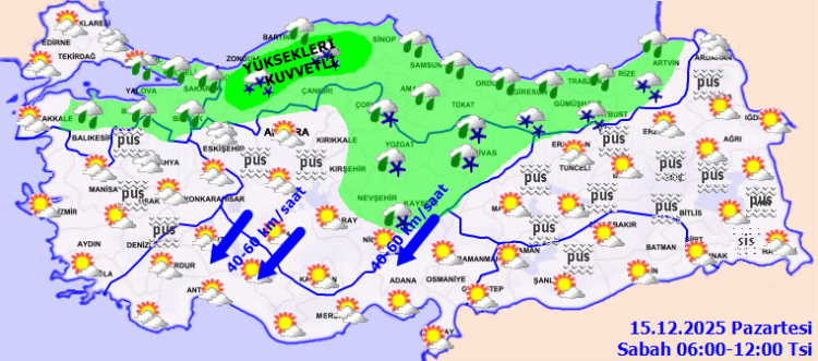 Sabah ve gece saatlerinde iç ve doğu kesimlerde pus ve yer yer sis hadisesi tahmin ediliyor. Rüzgarın, Akdeniz’in iç kesimlerinde rüzgarın kuzey kuzeydoğu yönlerden kuvvetli (40-60 km/sa) esmesi bekleniyor.